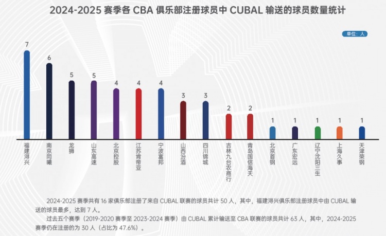 2月14日訊 近日,CBA公司發布《中國男子籃球職業聯賽國內球員基礎信息白皮書(2024-2025賽季)》。其中,本賽季各俱樂部中CUBAL輸送球員的統計情況如下。福建有7人最多、同曦6人第二,廣州和山東各5人。 本文標簽: CBA 中國籃球 籃球 廣東 遼寧 浙江 廣廈 新疆 北京 上海 山東 深圳 山西 廣州 江蘇 同曦 福建 吉林 天津 青島 四川 北控 寧波 CUBAL