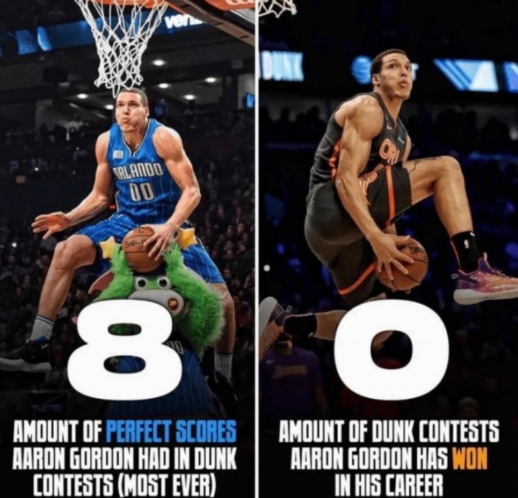 阿隆-戈登一共參加過三次扣籃大賽,他雖然8次拿到50分滿分,但一次扣籃王也沒拿到過。