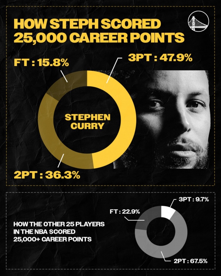 庫里25000分得分方式占比:兩分36.3%,三分47.9%,罰球15.8%;聯盟歷史上其他25位得分超25000的球員:兩分67.5%,三分9.7%,罰球22.9%。 本文標簽: 籃球 NBA 勇士 庫里
