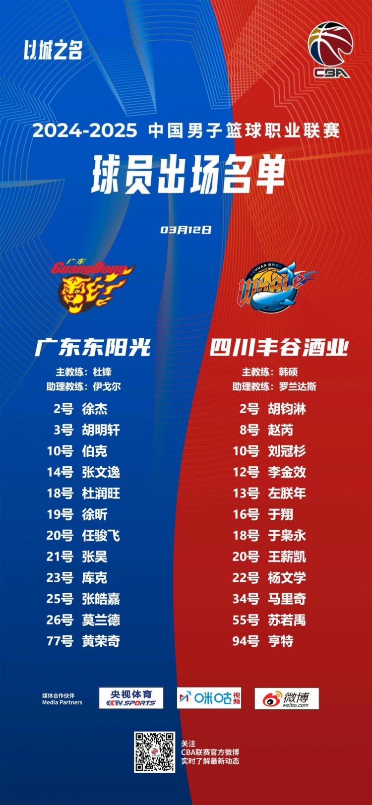 3月12日訊 CBA常規賽,廣東主場對陣四川,賽前雙方公布了本場比賽的大名單。具體如下:廣東隊:徐杰、胡明軒、伯克、張文逸、杜潤旺、徐昕、任駿飛、張昊、庫克、張皓嘉、莫蘭德、黃榮奇四川隊:胡鈞淋、趙芮、劉冠衫、李金效、左朕年、于翔、于梟永、王薪凱、楊文學、馬里奇、蘇若禹、亨特 本文標簽: 籃球 CBA 中國籃球 廣東 四川 胡明軒