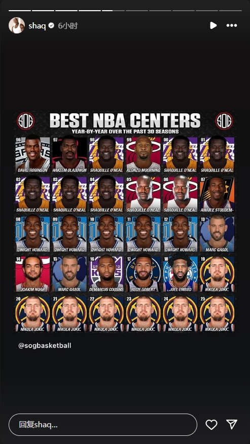 奧尼爾曬過去30年最佳中鋒:自己9年8度上榜 約基奇統治最近7年