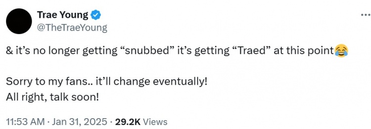 1月31日訊 NBA常規賽,老鷹在客場以113-137不敵騎士。特雷-楊無緣本賽季的全明星,對此,他更推道:“這不是被‘冷落’了,而是被‘特雷-楊’啦。對不住我的球迷們。這遲早會改變的!就這樣,回頭再聊。”值得一提的是,這是特雷-楊七個賽季的職業生涯中,第四次落選全明星。此役,特雷-楊出戰31分51秒,投籃16中5,三分8中2,罰球4中3,得到15分1籃板10助攻1搶斷。 本文標簽: NBA 籃球 老鷹 特雷-楊