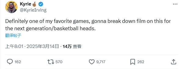 美媒寫道:“5年前的今天(2020年1月31日),歐文31分鐘砍下54分,僅投丟了4個(gè)球。”歐文則回復(fù)道:“這絕對是我最喜歡的比賽之一,我會為下一代(球員)/球迷們解析這場比賽。”