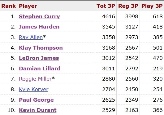 本場(chǎng)比賽過后,庫里生涯(常規(guī)賽+季后賽)的三分命中數(shù)來到4618記,距離5000記還有382記。