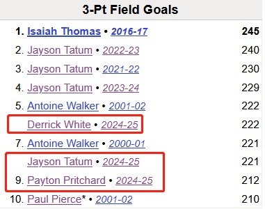 NBA常規賽,凱爾特人在客場以103-91擊敗熱火。據統計,本賽季凱爾特人有3員大將有望沖擊隊史單賽季的三分命中數紀錄,算上今天的數據,分別為:塔圖姆226球、德里克-懷特225球、普理查德215球。按照本賽季三人的場均命中數,結合綠軍剩余的場次數(15場),預計3人在本賽季結束時的三分進球數為:塔圖姆,280球懷特,278球普理查德,265球榜單第一名是小托馬斯的245球。本場比賽前數據 本文標簽: 籃球 NBA 雄鹿 塔圖姆 凱爾特人