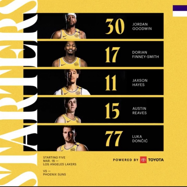 東契奇、里夫斯、古德溫、芬尼-史密斯、海斯將首發出場。