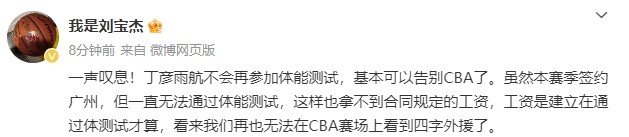 原文寫道:“一聲嘆息!丁彥雨航不會再參加體能測試,基本可以告別CBA了。雖然本賽季簽約廣州,但一直無法通過體能測試,這樣也拿不到合同規定的工資,工資是建立在通過體測試才算,看來我們再也無法在CBA賽場上看到四字外援了。 ???”