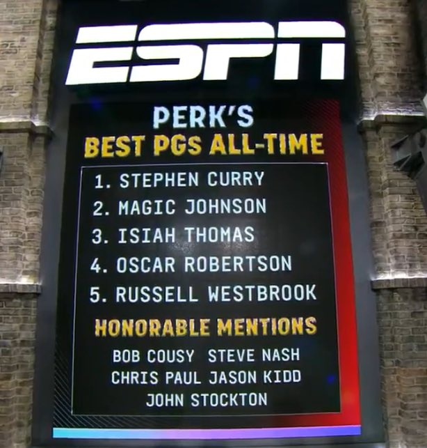 3月20日訊 近日,評論員帕金斯在節目上列出了他心目中歷史前5的控衛。1、庫里2、魔術師3、伊賽亞-托馬斯4、大O5、威少榮譽提名:鮑勃-庫西、納什、保羅、基德、斯托克頓。 本文標簽: 籃球 NBA 勇士 庫里 湖人 活塞 掘金 威少