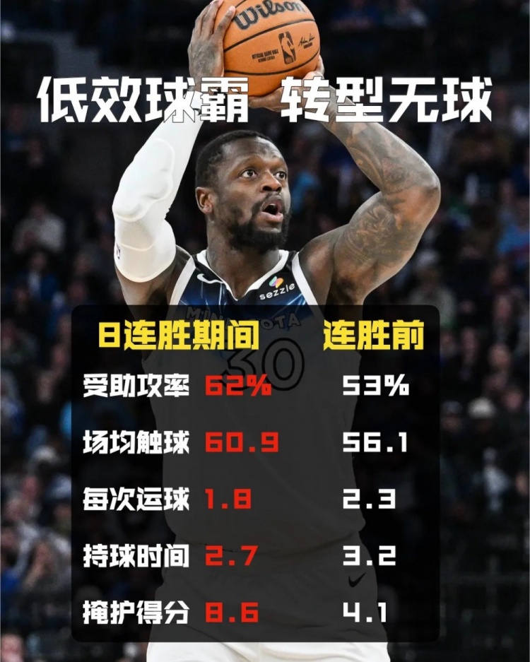 此前,蘭德爾每次觸球要運2.31次,并且球要在他手里停留平均3.29秒。而在開啟連勝后,蘭德爾在觸球次數增加的前提下,這兩項數據分別減少至1.76和2.69。
