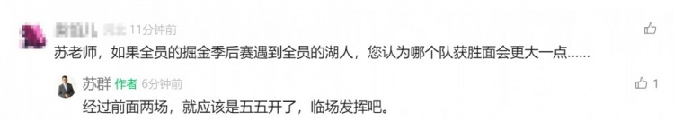 3月20日訊 今日NBA常規(guī)賽,湖人120-108戰(zhàn)勝掘金。本賽季雙方交手戰(zhàn)績來到了2-2。網友在蘇群公眾號評論區(qū)評論道:“蘇老師,如果全員的掘金季后賽遇到全員的湖人,您認為哪個隊獲勝面會更大一點……”蘇群回復道:“經過前面兩場,就應該是五五開了,臨場發(fā)揮吧?!?/p> 本文標簽: 籃球 NBA 湖人 掘金