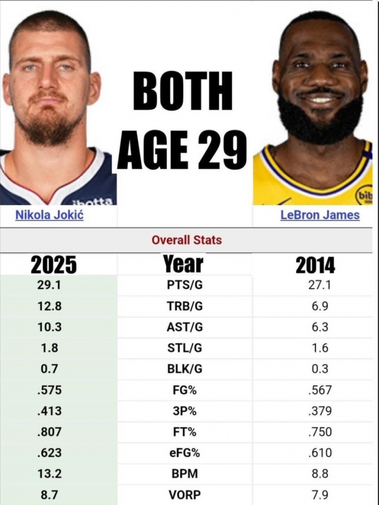 29歲約基奇場均29.1分12.8板10.3助1.8斷 各項數據皆>同期詹姆斯