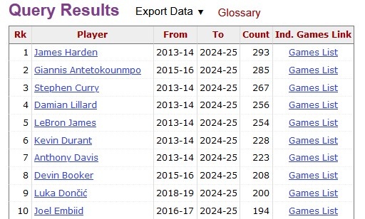 2014年至今聯(lián)盟球員30+場次數(shù)榜:哈登294第一 字母第二 庫里第三