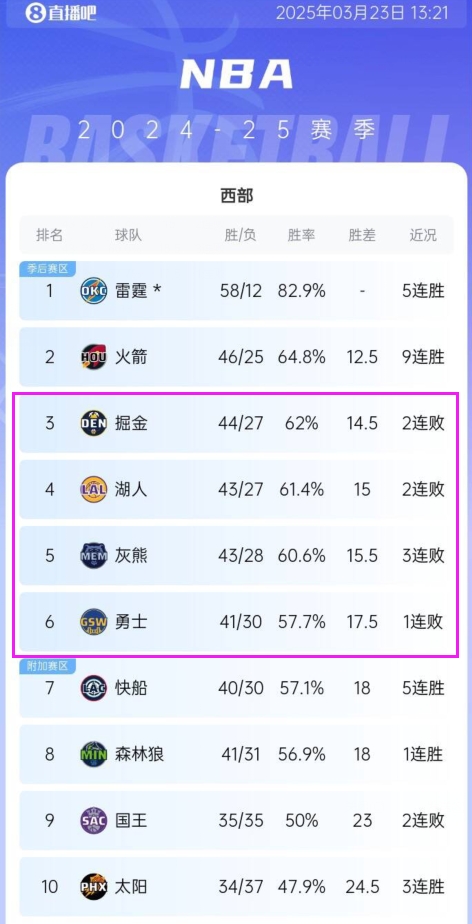 西部第3的掘金、第4的湖人、第5的灰熊和第6的勇士最近都在輸球;第7的快船打出5連勝,森林狼位居第8,兩隊(duì)都和第6的勇士(季后賽直通區(qū))只差0.5個(gè)勝場;第2的火箭豪取一波9連勝穩(wěn)住目前的排位;雷霆此前已經(jīng)鎖定西部第一的位置。