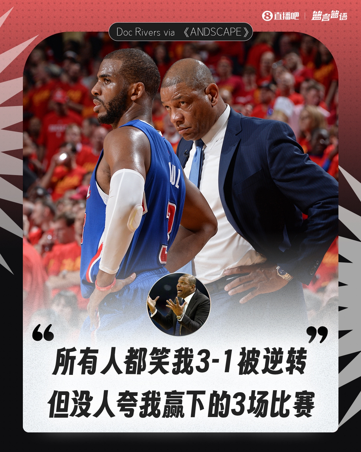 在談到自己飽受詬病的“系列賽多次3比1領先被翻盤”的話題時,里弗斯坦然表示:“我曾帶領一支排名第8的球隊3比1領先。在快船的那次是唯一一次讓勝利溜走了,沒有人講出真實的故事,沒人意識到保羅當時拖著一條傷腿在場上奔跑。這在某種程度上是不公平的,我贏得3場勝利沒有得到足夠的認可,大家只記住了輸掉的比賽。我總是說,‘如果我們6場內輸給火箭會怎樣?那就沒人在意了。’”