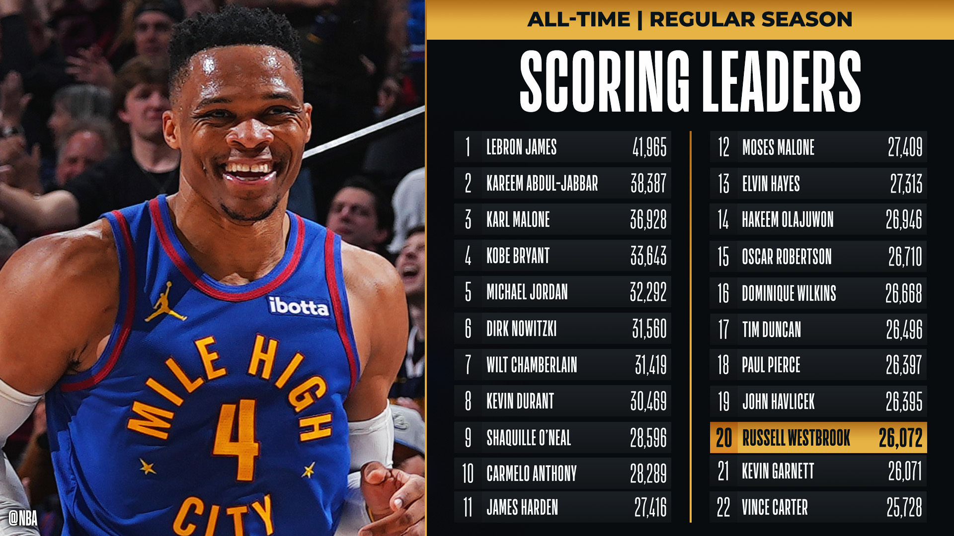 威少今日姍姍來遲,得分正式進入歷史前20!這樣一來,雷霆三少得分全部進入歷史前20!鏈接>>>恭喜????威少生涯總得分超越加內特 升至NBA歷史第20位!NBA歷史得分榜最新情況 本文標簽: 籃球 NBA 雷霆 快船 太陽 掘金 哈登 威少 杜蘭特