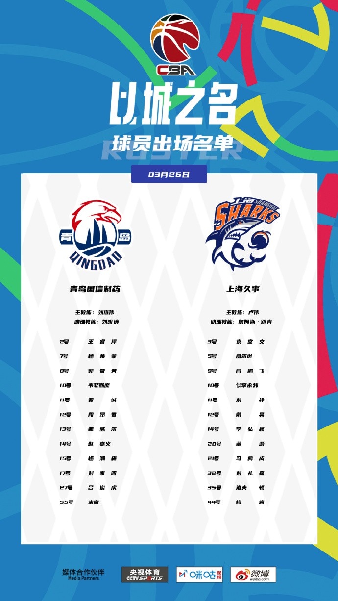 3月26日訊 今晚7點35分,青島男籃將在主場迎戰上海男籃。上海隊記者薛思佳在社媒上曬出了兩隊今天的大名單,具體如下:青島:王睿澤、楊金蒙、郭奇芳、韋瑟斯龐、賈誠、段昂君、鮑威爾、趙嘉義、楊瀚森、劉家昕、呂俊虎、米奇。上海:袁堂文、威爾遜、閆鵬飛、偰李永煒、劉錚、戴昊、李弘權、董灝、馬典成、劉禮嘉、洛夫頓、梅肯。 本文標簽: 籃球 CBA 中國籃球 青島 上海 楊瀚森