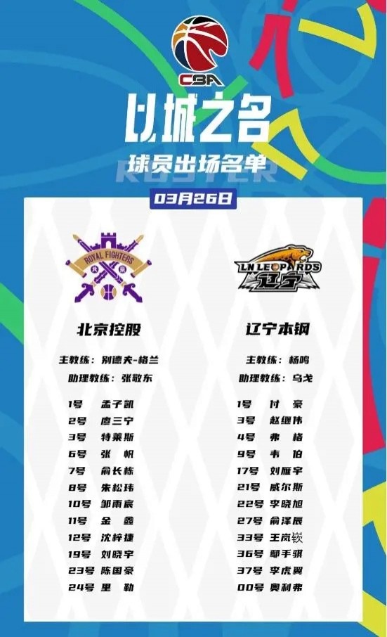 3月26日訊 今晚7點35分,北控男籃將在主場迎戰遼寧男籃。媒體人@球圈趙探長 在社媒上曬出了兩隊今天的大名單,具體如下:北控:孟子凱、廖三寧、特萊斯、張帆、俞長棟、朱松瑋、鄒雨宸、金鑫、沈梓捷、劉曉宇、陳國豪、里勒。遼寧:奧利弗、付豪、趙繼偉、弗格、韋伯、劉雁宇、威爾斯、李曉旭、余澤辰、王嵐嵚、鄢手騏、李虎翼。 本文標簽: 籃球 CBA 中國籃球 北控 遼寧
