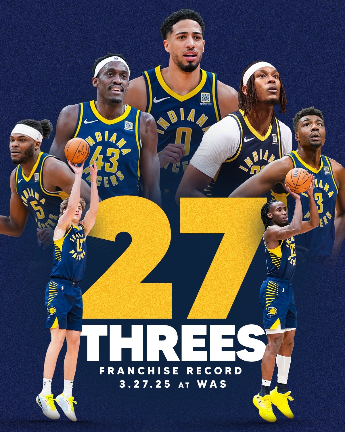 此役,步行者全隊命中27記三分,創造隊史紀錄,此前最多是23記三分。