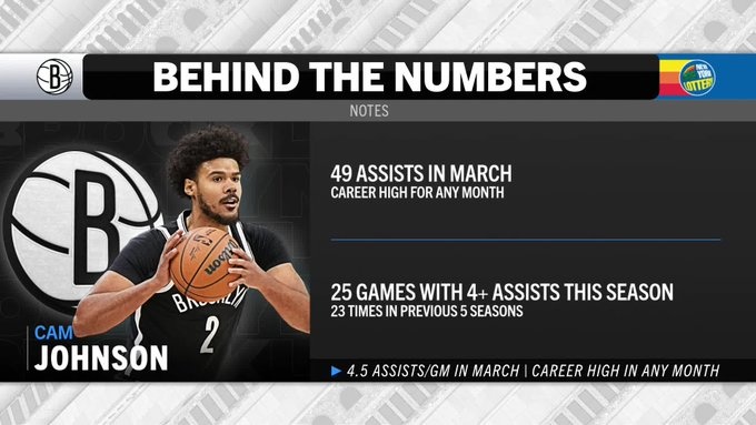 3月29日訊 今天上午7:30,籃網對陣快船。轉播方曬出一組數據,籃網球員卡梅隆-約翰遜在3月已送出49次助攻、場均4.5次,這2項數據是他個人生涯的單月新高。同時,黃忠本賽季已有25次單場助攻4+,而他此前5個賽季合計僅做到23次。 本文標簽: 籃球 NBA 籃網