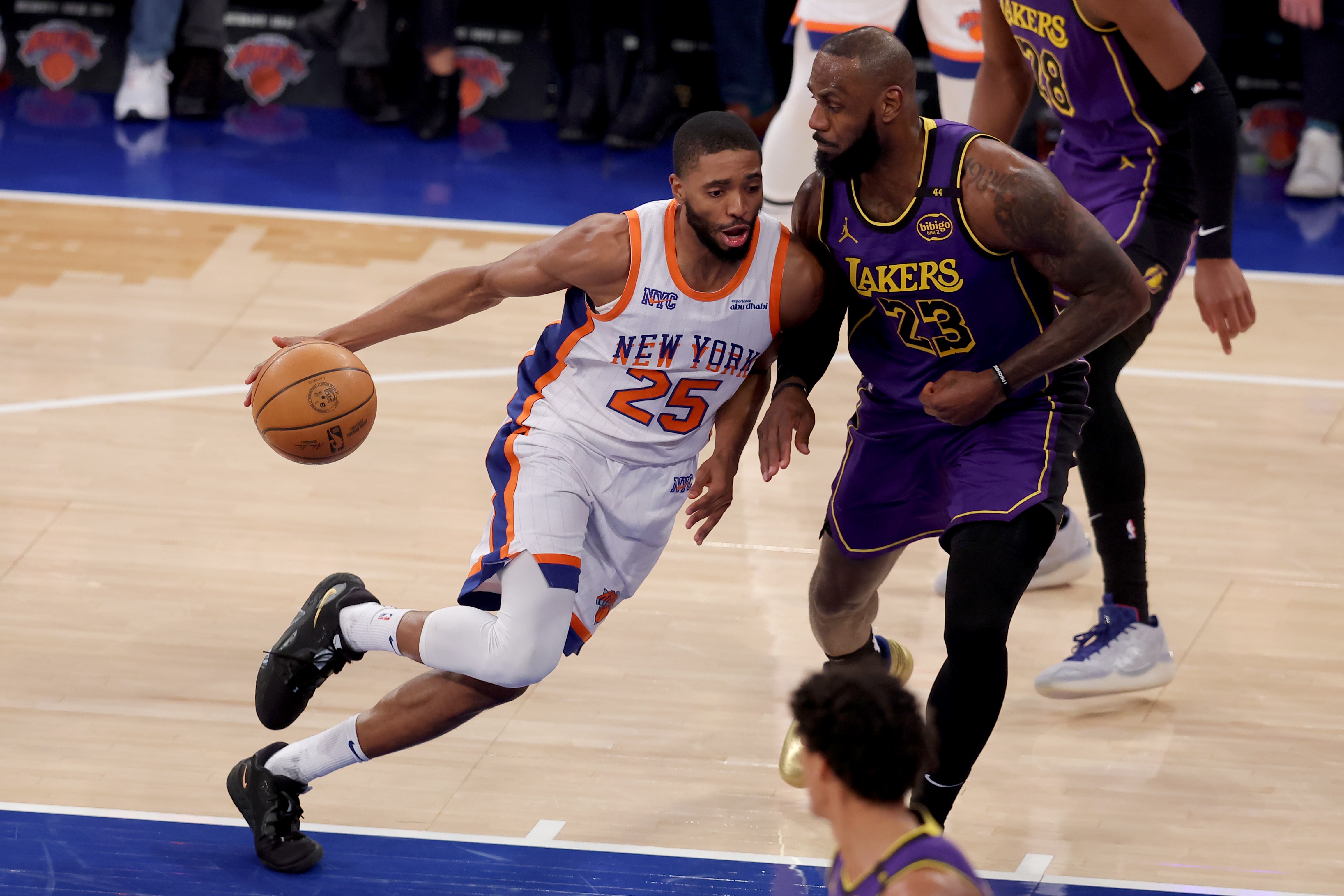 尼克斯也用唐斯低位單打去懲罰湖人小球陣,吸引夾擊,團隊轉(zhuǎn)移球,布倫森、哈特、布里奇斯、阿努諾比輪番接球二次啟動,五外拉開,往復突分,人人都能持球攻,按住葫蘆浮起瓢;一旦唐斯休息,尼克斯圍繞阿丘瓦擋拆和手遞手聯(lián)動外圍攻擊點,185公分的麥克布萊德在和阿丘瓦二人轉(zhuǎn)中打出了震撼的干拔跳投表現(xiàn),緊咬分差,死戰(zhàn)不退。