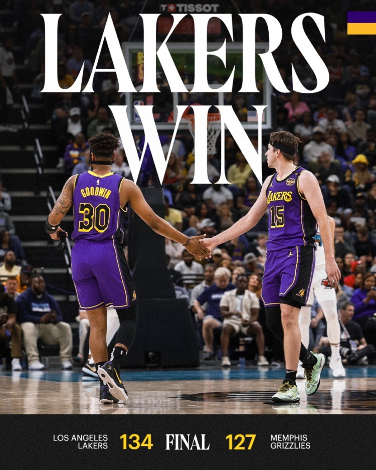 3月30日訊 NBA常規賽,湖人134-127戰勝灰熊,拿下了卡位大戰。賽后,湖人官推把小里和古德溫擊掌的瞬間放上了贏球海報。此役,里夫斯16中8,三分8中5,罰球10中10,得31分7板8助2斷1帽;古德溫2中0,三分1中0,沒有得分,僅1個前場籃板。 本文標簽: NBA 籃球 湖人