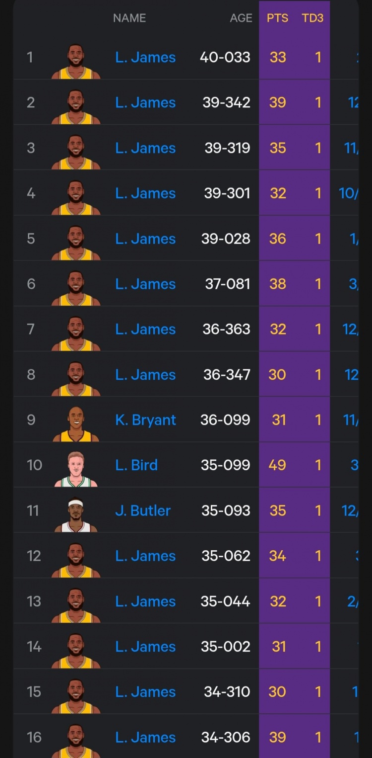 2月2日訊 湖人今日客場128-112擊敗尼克斯。詹姆斯本場出戰36分49秒,26投14中,三分8中3,罰球4中2,砍下33分11籃板12助攻的三雙。至此,40歲33天的詹姆斯再次刷新了自己保持的“聯盟砍三雙最老的球員”紀錄,原先紀錄是在詹姆斯39歲342天的時候創下。 本文標簽: 籃球 NBA 湖人 詹姆斯