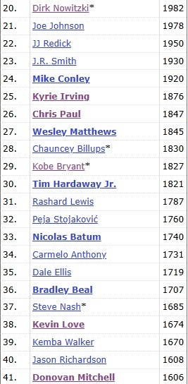 3月31日訊 騎士主場127-122險勝快船,米切爾本場比賽砍下24分12籃板7助攻4搶斷,命中兩記三分球。加上這兩記三分,米切爾生涯三分數1608,追平杰森-理查德森排名NBA歷史第40位,第39位的是肯巴-沃克(1670)。而在現役球員中,米切爾則排在第20,排在他前面的是樂福的1674記。 本文標簽: 籃球 NBA 騎士 米切爾