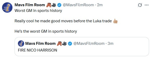 4月1日訊 NBA常規賽,獨行俠在主場以109-113不敵籃網。賽后,獨行俠自媒體Mavs Film Room破防,連發兩條推文痛斥獨行俠GM尼克-哈里森。“炒掉尼克-哈里森!”“體育史上最爛的GM。“在交易東契奇之前他做出過很酷的交易舉動????????“但現在他是體育史上最糟的總經理。” 本文標簽: 籃球 NBA 獨行俠 東契奇