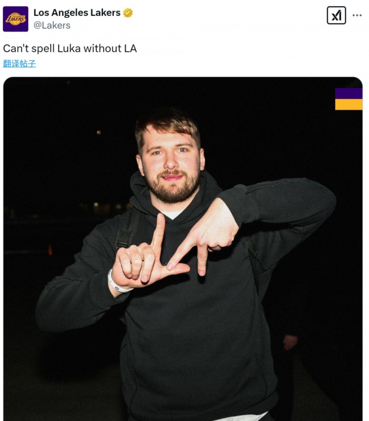 湖人官方曬出了他比“LA(洛杉磯簡稱)”手勢的照片,寫道:“少了LA(這兩個字母)是拼不出Luka(盧卡)的。”