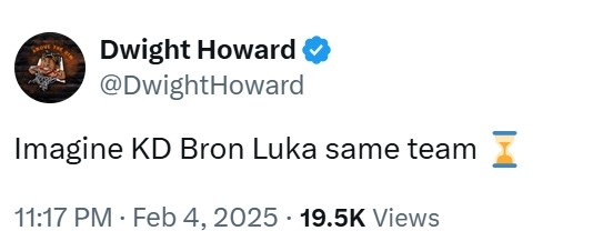 2月4日訊 今天,前NBA球員德懷特-霍華德更推道:“想象一下杜蘭特、勒布朗和東契奇在一支球隊??。”
