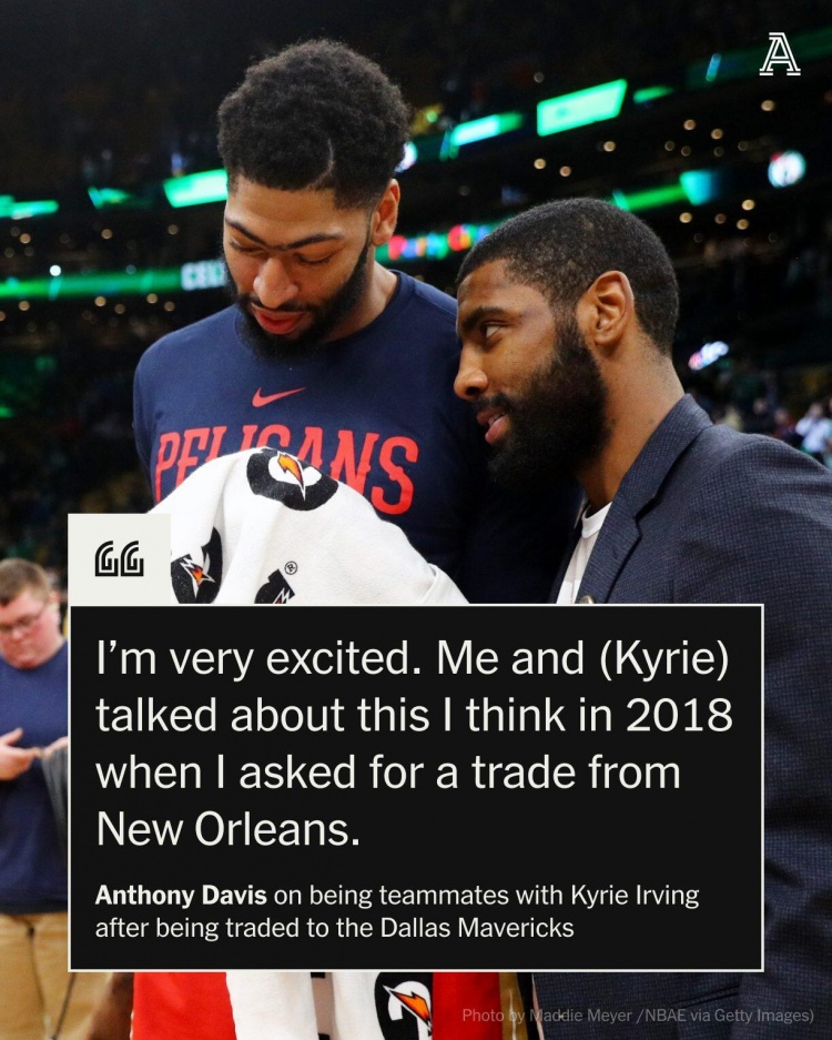 談到和歐文搭檔,濃眉說道:“我感覺很興奮。我2018年在鵜鶘申請(qǐng)交易的時(shí)候就和歐文談?wù)撨^這件事。我們一直想一起打球。現(xiàn)在我們有機(jī)會(huì)這樣做了。”