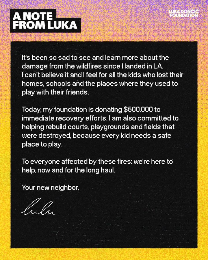 02月11日訊 東契奇宣布,他的基金會將捐款50萬美元,用于幫助山火后的緊急重建工作,公告如下: