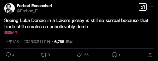 02月11日訊 NBA常規賽,湖人主場132-113大勝爵士。本場比賽東契奇上演湖人生涯首秀,他首發登場23分33秒,14投5中,得到14分5籃板4助攻,正負值+15。賽后,快船隊記Farbod Esnaashari發推寫道:“看到盧卡-東契奇身穿湖人球衣依然讓人感覺很不真實,因為那筆交易是那么不可理喻!愚蠢?!?/span> 本文標簽: 籃球 NBA 湖人 東契奇
