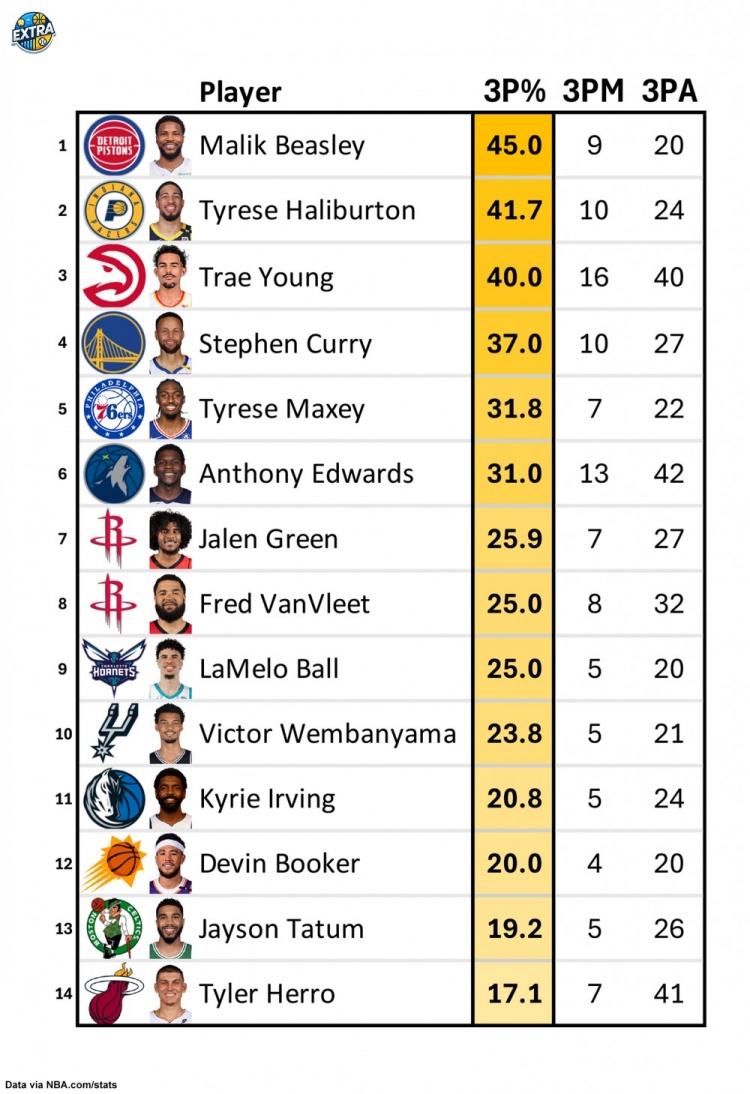 2月12日訊 NBA常規賽,活塞132-92大勝公牛。比斯利本場命中了7記三分。據統計,本賽季共有14名球員在關鍵時刻(常規時間最后5分鐘或加時賽且分差不超過5分)出手了至少20記三分,這14人按命中率排名比斯利最準,庫里排第4,文班第10,具體如下圖:相關新聞>>>54場212記!馬利克-比斯利單賽季212記三分榮登隊史第一 貝排第二 本文標簽: NBA 籃球 活塞 勇士 庫里 老鷹 特雷-楊 步行者