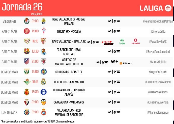2月14日訊 西甲官方公布了第26輪比賽的開球時(shí)間,巴薩vs皇家社會(huì)3月2日1點(diǎn)30分開球,貝蒂斯vs皇馬3月2日23點(diǎn)15分開球。