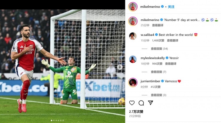 2月16日訊 阿森納在本輪英超客場2-0力克萊斯特城,梅里諾替補雙響建功。第81分鐘,阿森納前場進攻,恩瓦內里起球送到門前,梅里諾頭球攻門得手。第87分鐘,特羅薩德左路得球,擺脫后送出傳中,后點梅里諾跟進推射得手。梅里諾首次客串中鋒便打進2球,他也通過社媒曬出自己進球后的慶祝照,并配文:“9號位上班日… ????????” 本文標簽: 足球 英超 阿森納 萊斯特城