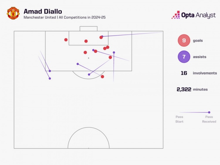 數據統計顯示,阿瑪德本賽季為曼聯各項賽事共計直接參與16球,在隊內僅次于參與21球的B費。