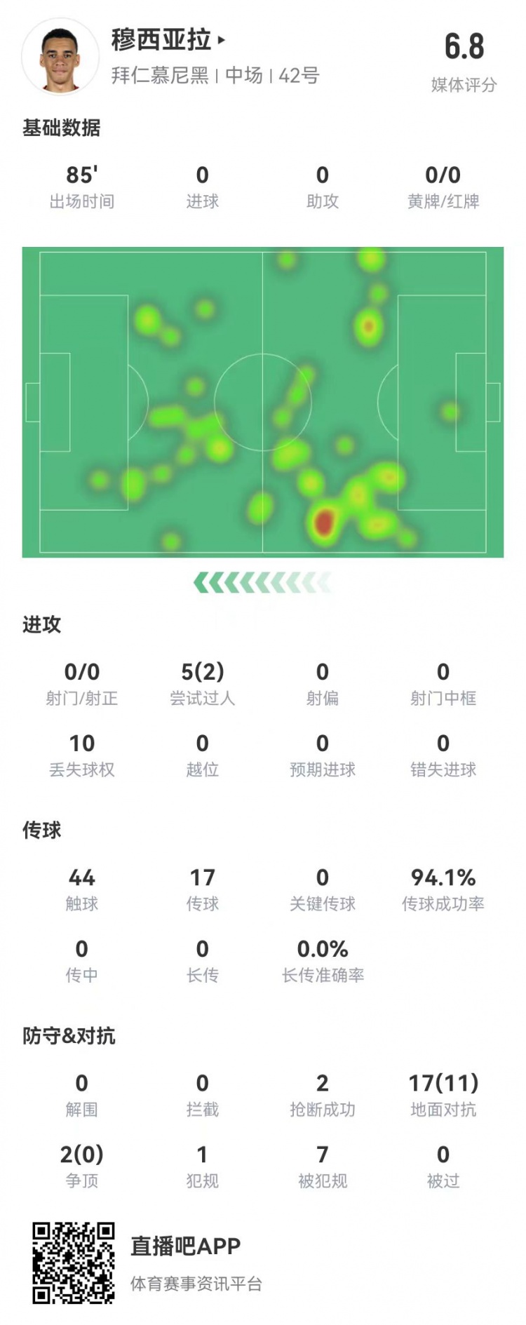 2月16日訊 拜仁在本輪德甲客場0-0暫時戰平勒沃庫森,剛剛頂薪續約的穆西亞拉本場數據如下:首發出戰85分鐘45觸球18傳球、17成功,成功率94%0射門0關鍵傳球0傳中0長傳5過人、2成功19對抗、11成功10丟失球權1犯規7造犯規2搶斷獲評6.8分 本文標簽: 足球 德甲 拜仁慕尼黑 勒沃庫森