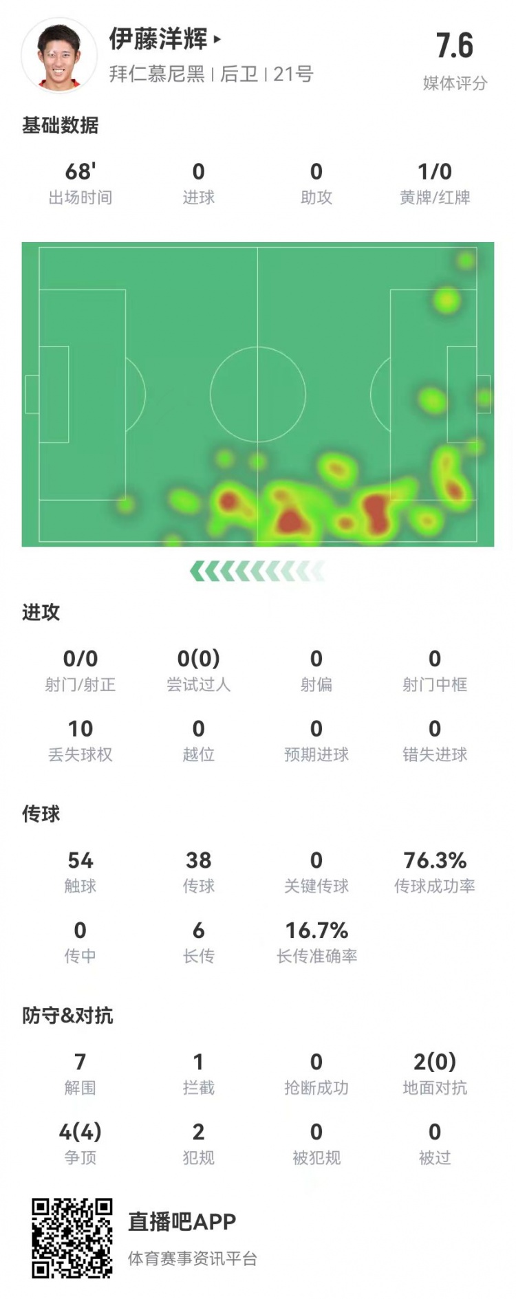 2月16日訊 拜仁在本輪德甲0-0暫時戰平勒沃庫森,迎來德甲首秀的新援伊藤洋輝本場數據如下:出場68分鐘7解圍1封堵1攔截1門線解圍6對抗、4成功10丟失球權2犯規54觸球38傳球、29成功,成功率76%6長傳、1成功獲評7.6分 本文標簽: 足球 德甲 拜仁慕尼黑 勒沃庫森