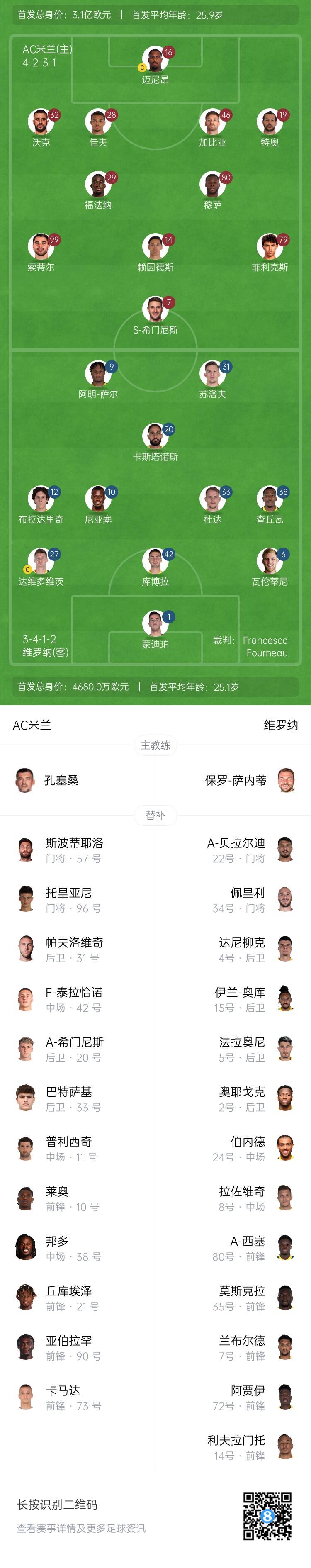 AC米蘭替補(bǔ):57-斯波蒂耶洛、96-托里亞尼、10-萊奧、11-普利西奇、20-A-希門尼斯、21-丘庫(kù)埃澤、31-帕夫洛維奇、33-巴特薩基、38-邦多、42-泰拉恰諾、73-卡馬達(dá)、90-亞伯拉罕