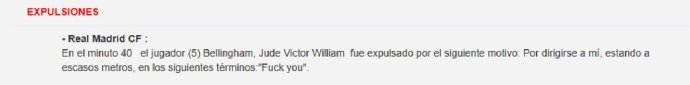 2月16日訊 西甲第24輪,皇馬1-1戰(zhàn)平奧薩蘇納,貝林厄姆遭紅牌罰下。在賽后裁判報(bào)告中,談及貝林厄姆被紅牌罰下的原因:他在距離我僅數(shù)米遠(yuǎn)的地方,對(duì)我說了“Fxxk you”。相關(guān)新聞:直紅原因!貝林對(duì)裁判說"f**k off",裁判向魔笛說聽到"f**k you" 本文標(biāo)簽: 西甲 皇家馬德里 奧薩蘇納 足球