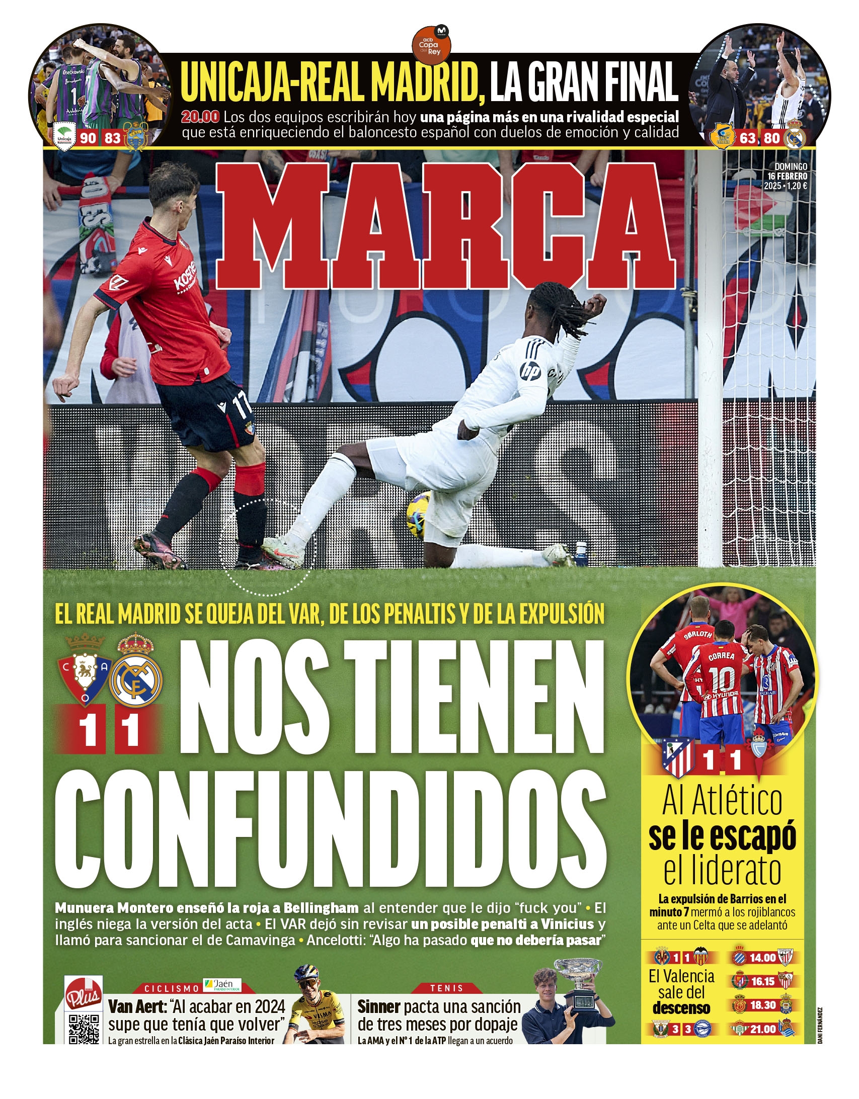 2月16日訊 西甲第24輪比賽,皇馬客場1-1戰平奧薩蘇納,貝林厄姆染紅離場,此役主裁穆努埃拉和VAR的多次判罰引發爭議。