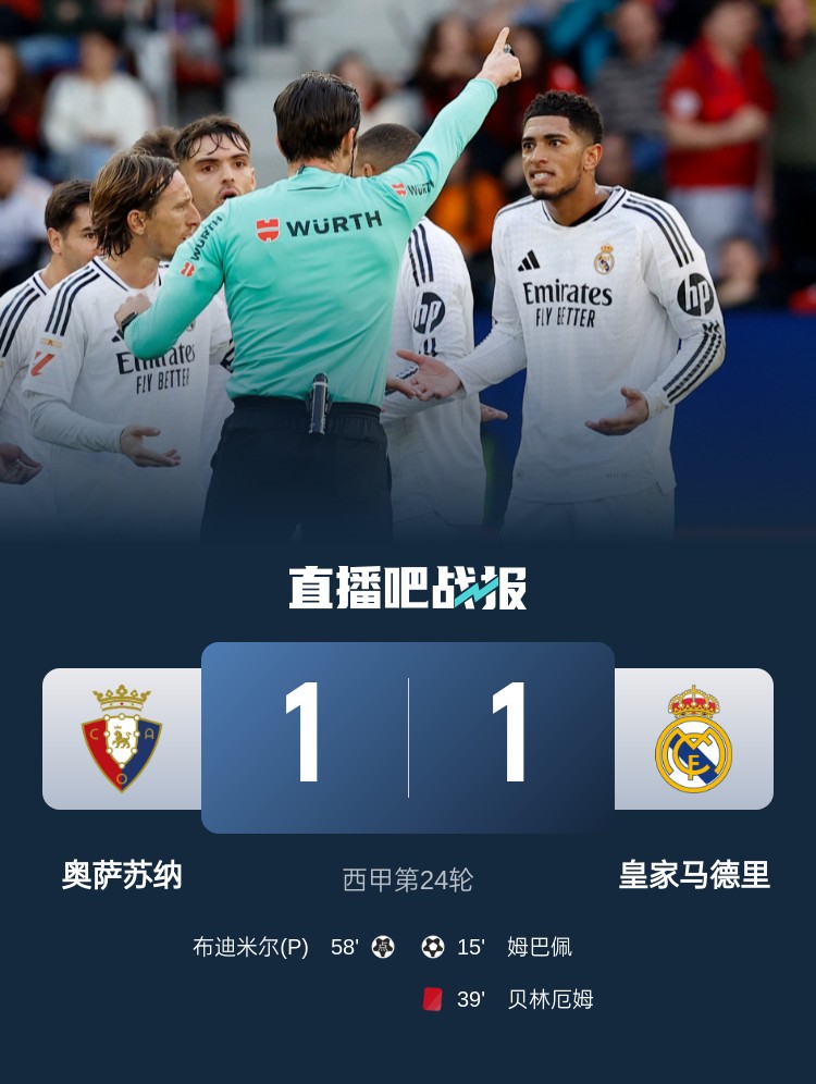 判罰爭議不斷!皇馬本輪1-1戰平奧薩蘇納,姆巴佩破門,貝林厄姆染紅。
