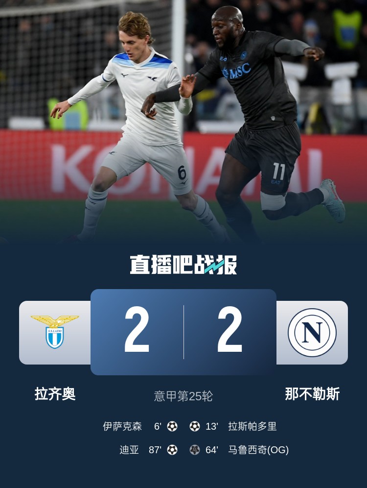 遭絕平!那不勒斯2-2拉齊奧意甲遭遇3連平 多賽1場領先國米2分