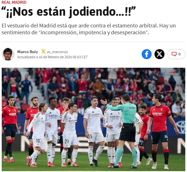 阿斯報表示,在皇馬返回馬德里的飛機上弗洛倫蒂諾也在,而所有人都對本場的裁判組很不滿。更衣室的人員:球員、教練組與高層,聽到的最多的抱怨聲就是:“Nos están jodiendo…”(They are f**king us:他們就是要搞我們)。阿斯報從消息人士處得知,更衣室對西甲的怨念已經很深。這種沮喪的情感還伴隨著“不理解,無助和絕望”的感受。皇馬認為這就是徹底的不公平。大家都在反復地質問:為什么啊?