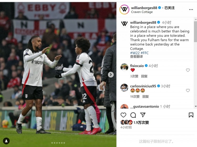 2月17日訊 英超第25輪比賽,富勒姆主場2-1擊敗諾丁漢森林,36歲巴西邊鋒威廉替補出場,上演回歸富勒姆之后的首秀。威廉在社交媒體上曬出自己替補出場的照片,配文:“在一個受人贊美的地方,比在一個被人容忍的地方要好得多。感謝富勒姆球迷昨天在克拉文農(nóng)場球場對我的熱情歡迎。” 本文標(biāo)簽: 足球 英超 富勒姆