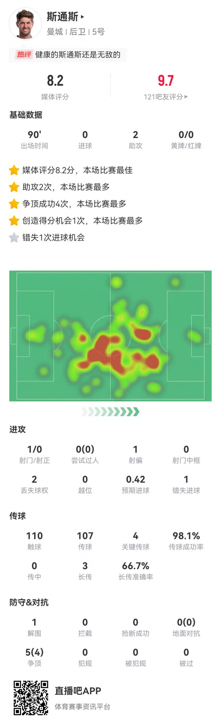 1月30日訊 曼城在本輪歐冠逆轉(zhuǎn)布魯日,斯通斯本場數(shù)據(jù)如下:首發(fā)踢滿全場預(yù)期進球0.422助攻預(yù)期助攻0.071解圍5對抗、4成功2丟失球權(quán)110觸球107傳球、105成功,成功率98%4關(guān)鍵傳球3長傳、2成功1創(chuàng)造重大機會1射門、0射正1錯失重大機會獲評8.2分全場最高 本文標(biāo)簽: 足球 英超 曼城 歐冠