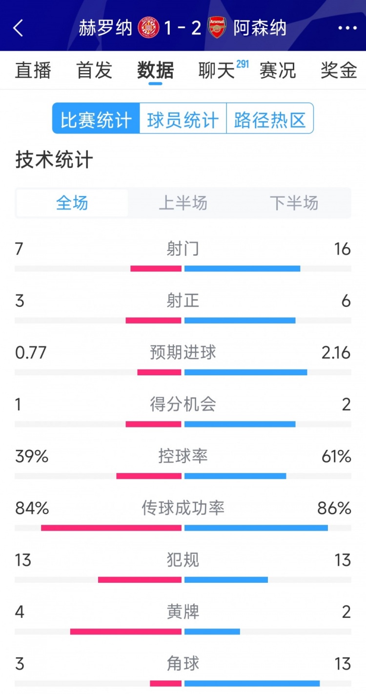 1月30日訊 在本輪歐冠,阿森納2-1擊敗赫羅納,以下為雙方全場數據對比:赫羅納vs阿森納射門:7-16射正:3-6預期進球:0.77-2.16得分機會:1-2控球率:39%-61%傳球成功率:84%-86%犯規:13-13黃牌:4-2角球:3-13 本文標簽: 足球 英超 阿森納