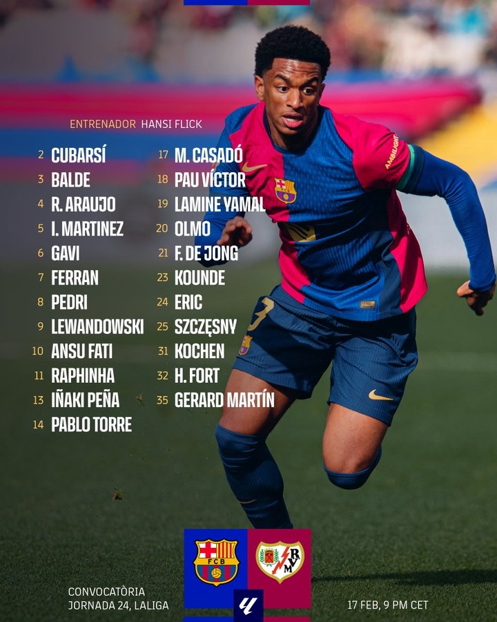 2月17日訊 北京時間明天凌晨4點,巴薩將在西甲主場迎戰巴列卡諾,球隊今天公布了比賽名單,具體如下:門將:13-佩尼亞、25-什琴斯尼、31-科亨后衛:2-庫巴西、3-巴爾德、5-伊尼戈、23-孔德、24-埃里克-加西亞、32-福特、35-杰拉德-馬丁中場:6-加維、8-佩德里、14-巴勃羅-托雷、17-卡薩多、20-奧爾莫、21-德容前鋒:7-費蘭、9-萊萬、10-法蒂、11-拉菲尼亞、18-維克托、19-亞馬爾 本文標簽: 足球 西甲 巴塞羅那