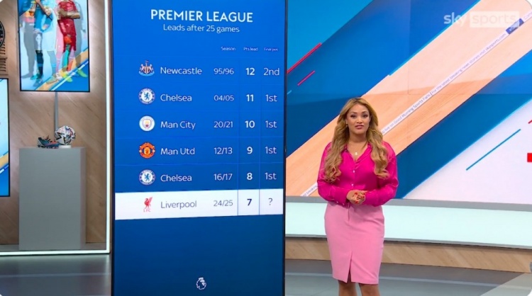 天空體育統(tǒng)計(jì)英超25輪積分領(lǐng)先7+球隊(duì):